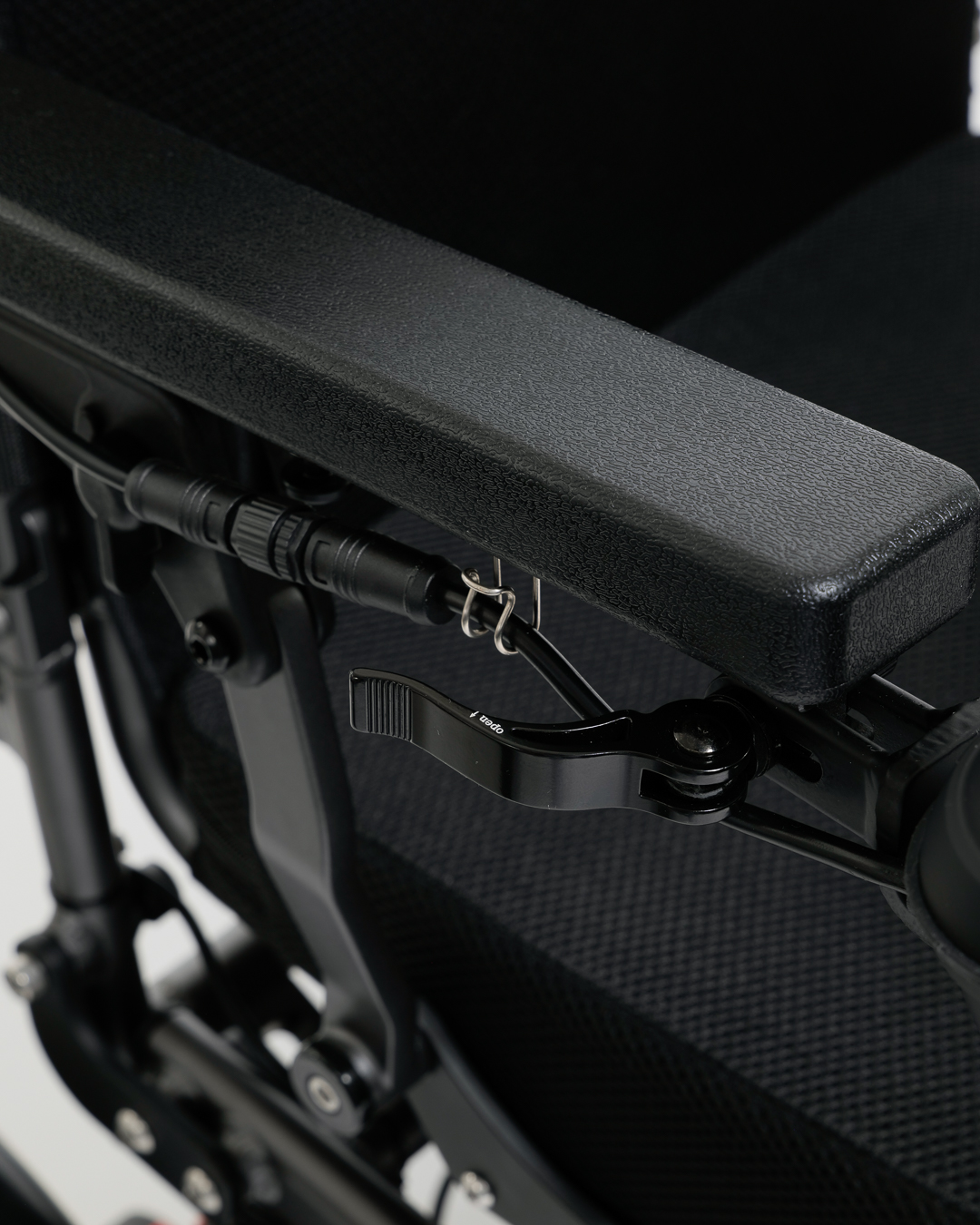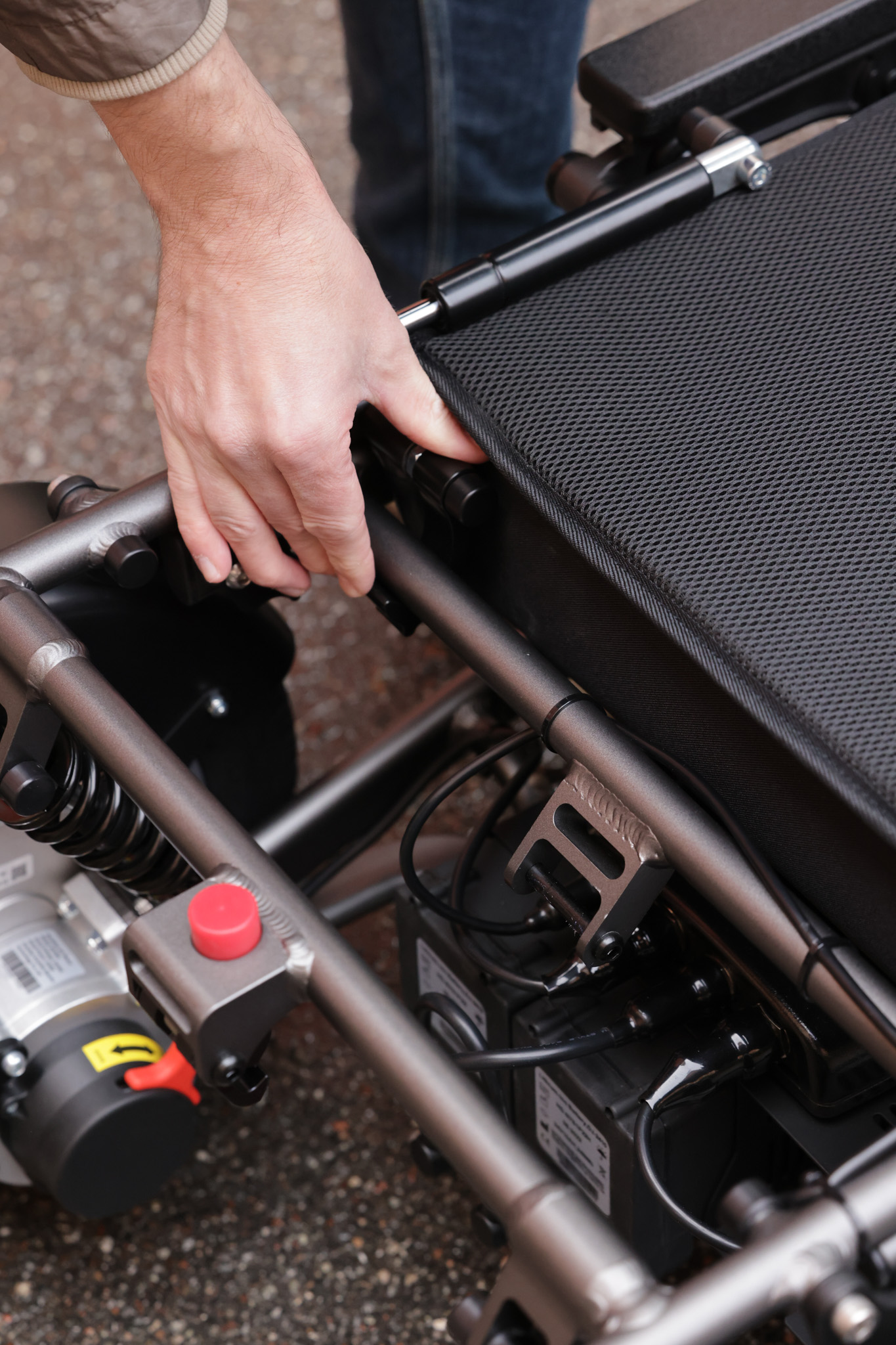 Ses accoudoirs et son repose-pieds réglables offrent un des ajustements personnalisés. Équipé de trois compartiments pour batteries, ce modèle offre une utilisation prolongée pour les trajets plus longs. Lorsqu’il est plié, un verrou de sécurité pratique maintient le fauteuil roulant en position pliée pour faciliter transport et rangement.