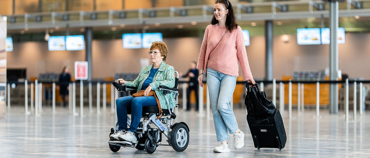 Lors de la réservation de votre voyage, assurez-vous d’indiquer que vous souhaitez apporter un fauteuil roulant électrique sur le vol. La compagnie aérienne vous soumettra ensuite un questionnaire de suivi, portant notamment sur le poids et la taille du fauteuil roulant électrique, ainsi que sur le type, le poids et la puissance des batteries. Vous pouvez trouver des réponses à ces questions dans les documents ci-dessous. À votre arrivée à l’aéroport, présentez-vous au comptoir d’enregistrement habituel. Ils se coordonneront avec le service d’assistance de l’aéroport pour vous fournir un fauteuil roulant manuel à utiliser à l’aéroport. Après l’enregistrement, apportez votre Eloflex à la zone spéciale de récupération des bagages où ils se chargeront du transport du fauteuil roulant électrique jusqu’à l’avion. Si vous ne disposez pas d’une housse de protection, nous vous recommandons d’en louer une à l’aéroport.